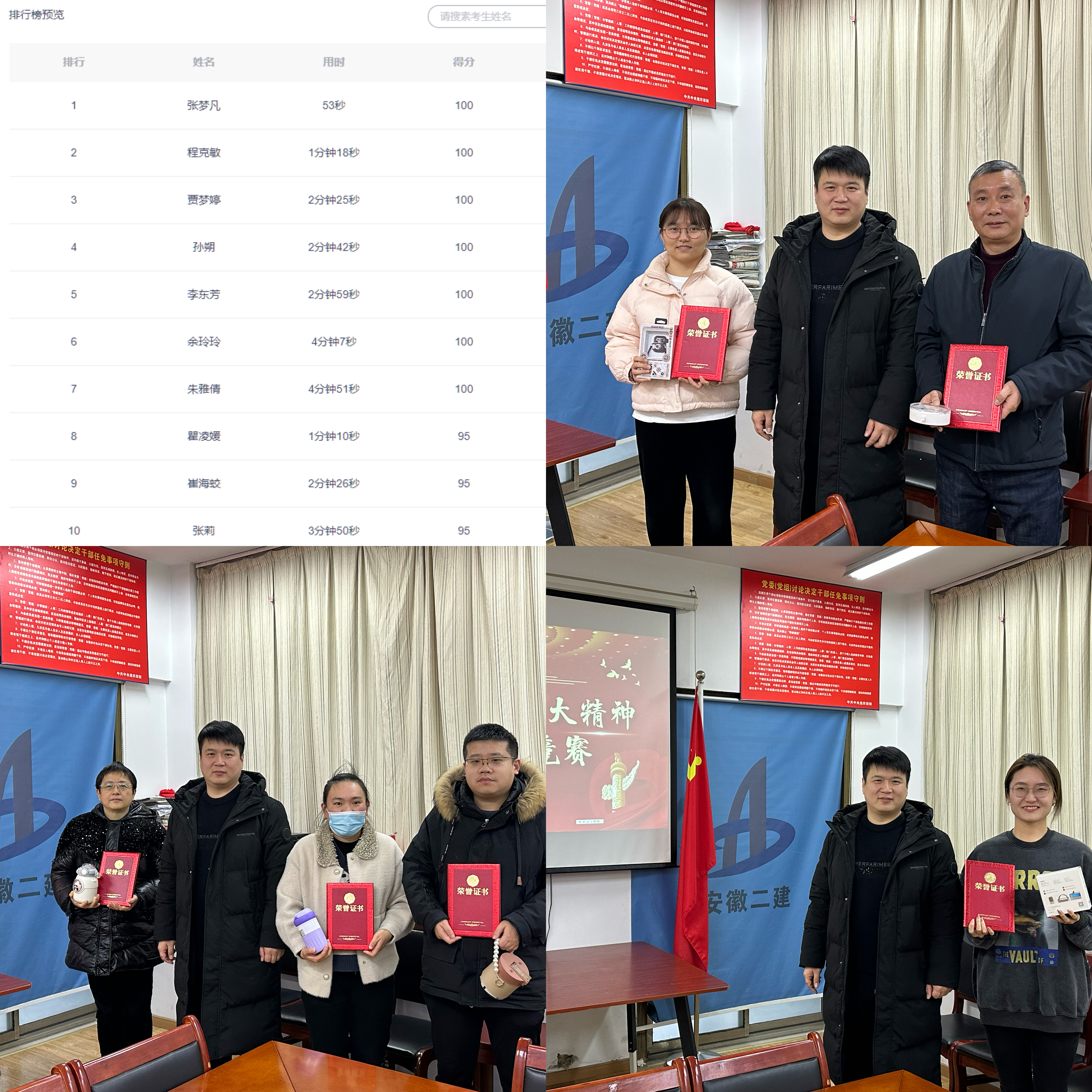 經過一天的線上答題比拼,分公司張夢凡等6名同志分別獲得競賽一、二、三名的好成績,2月9日,分公司經理、黨支部副書記潘澤強為獲獎同志頒發(fā)獲獎證書及獎品,祝賀他們在競賽活動中取得好成績,并要求青年要始終堅持黨的理論學習,把這種學習氛圍保持好,發(fā)揚好。
