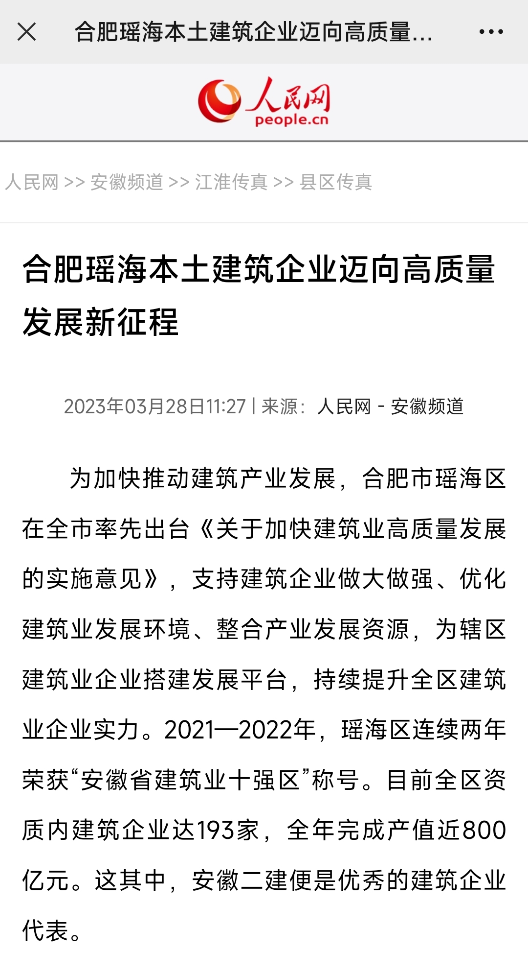 3月28日,人民網(wǎng)安徽頻道、中國網(wǎng)韻動安徽、中國日報網(wǎng)、安徽日報、大皖新聞、瑤海發(fā)布等權(quán)威主流媒體相繼報道安徽二建公司建企70周年發(fā)展成就,滿懷信心邁向高質(zhì)量發(fā)展新征程。