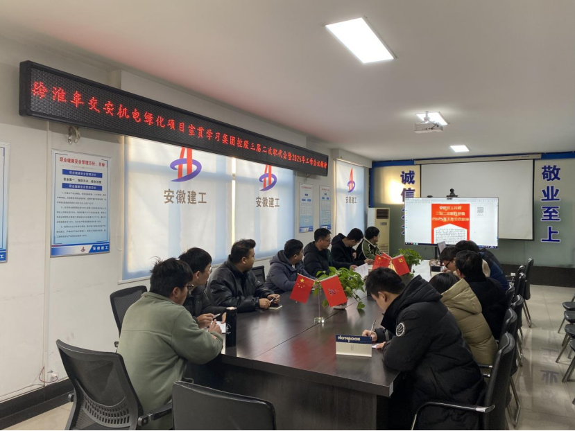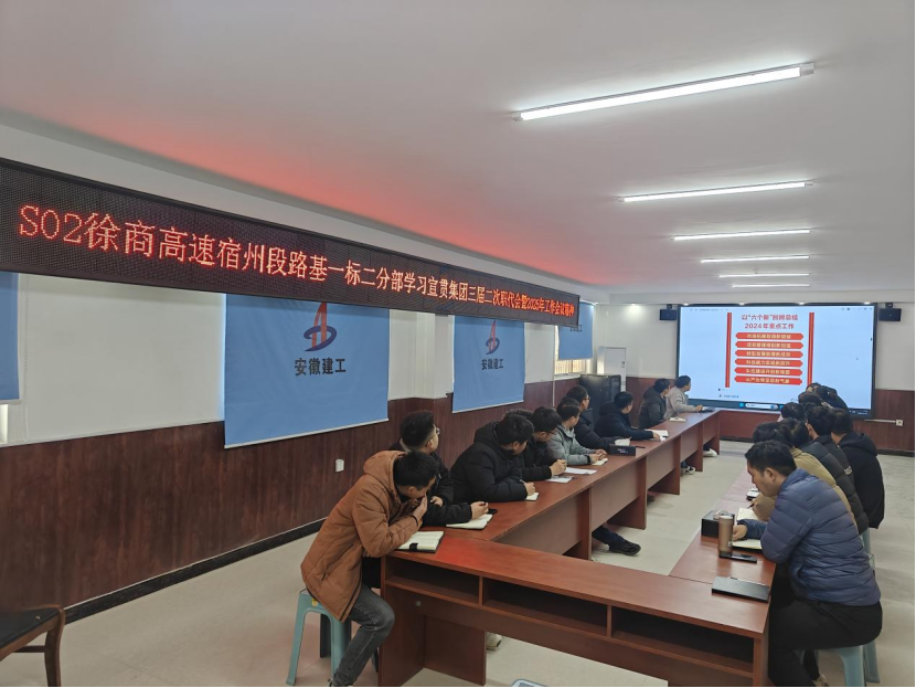 近日 ,安徽建工建設(shè)投資發(fā)展有限公司組織徐淮阜交安機電綠化項目部和S02徐商高速宿州段一標(biāo)二分部項目學(xué)習(xí)宣貫集團三屆二次職代會暨2025年工作會議精神,確保會議精神在項目一線落地生根。