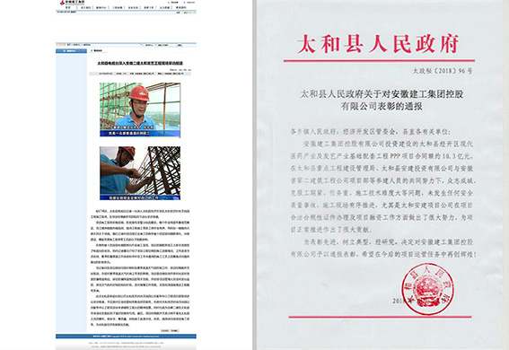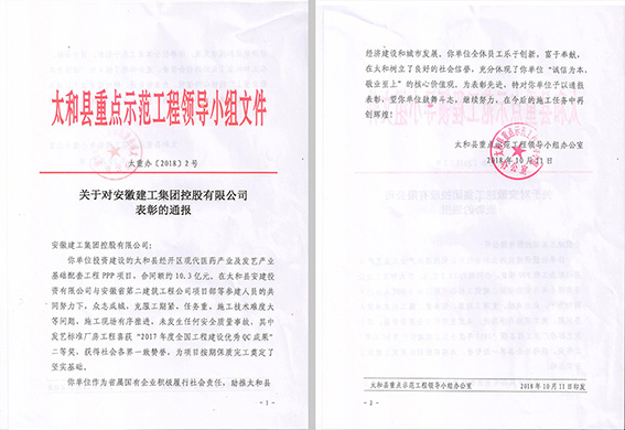 經過兩年的“浴血奮戰(zhàn)”,2018年9月30日,太和PPP項目完成交工驗收工作,項目建設圓滿收官,并受到太和縣人民政府及太和縣重點示范工程領導小組辦公室的一致表彰,為公司品牌宣傳,形象提升做出積極努力,為“打造一流安徽建工”添磚加瓦。