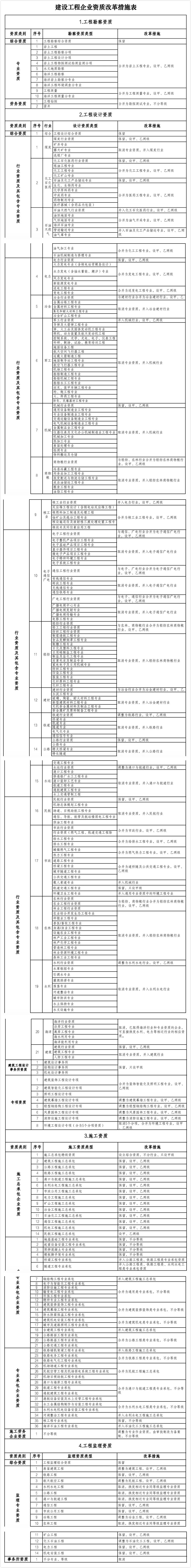 為保持資質(zhì)管理政策的穩(wěn)定性和連續(xù)性,避免對企業(yè)正常生產(chǎn)經(jīng)營造成干擾,保障工程質(zhì)量安全,在維持工程勘察、工程設(shè)計(jì)、施工、工程監(jiān)理等資質(zhì)標(biāo)準(zhǔn)框架基本不變的同時,按照“能減則減、能并則并”的原則,大幅壓減企業(yè)資質(zhì)類別和等級。(詳見下文建設(shè)工程企業(yè)資質(zhì)改革措施表)對可由市場自主選擇、行業(yè)自律進(jìn)行調(diào)節(jié)的企業(yè)資質(zhì)類別予以取消。對部分專業(yè)劃分過細(xì)、業(yè)務(wù)范圍相近、市場需求較小的企業(yè)資質(zhì)類別予以合并。對部分設(shè)置過多的資質(zhì)等級進(jìn)行歸并,減少資質(zhì)層級。