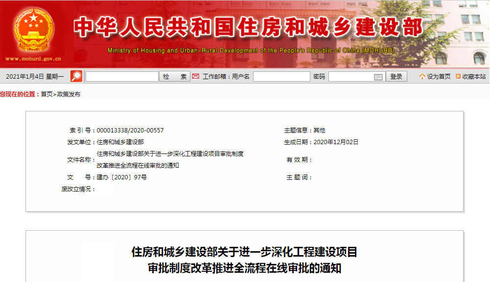 近日,住房和城鄉(xiāng)建設(shè)部印發(fā)通知,要求深化工程建設(shè)項目審批制度改革,加快推進(jìn)工程建設(shè)項目全流程在線審批,不斷提升工程建設(shè)項目審批效能,優(yōu)化營商環(huán)境。
