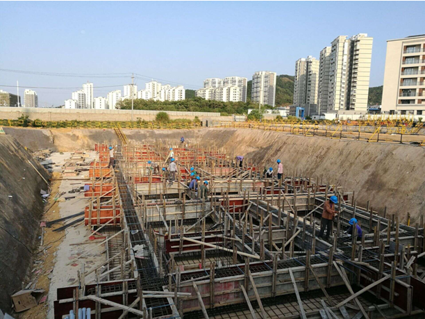 該項目位于宿松縣東北新城將軍山東路,工程包括12棟住宅樓和1座地下車庫,總建筑面積92840.29㎡。其中住宅樓建筑面積69027.76㎡,為框架剪力墻結構,住宅樓層高2.9m,建筑高度37.2m;地下車庫總建筑面積14289.53㎡,其中人防地下室建筑面積6996.32㎡,非人防地下室7293.21㎡,為筏板基礎框剪結構,地下車庫結構層高3.8m。