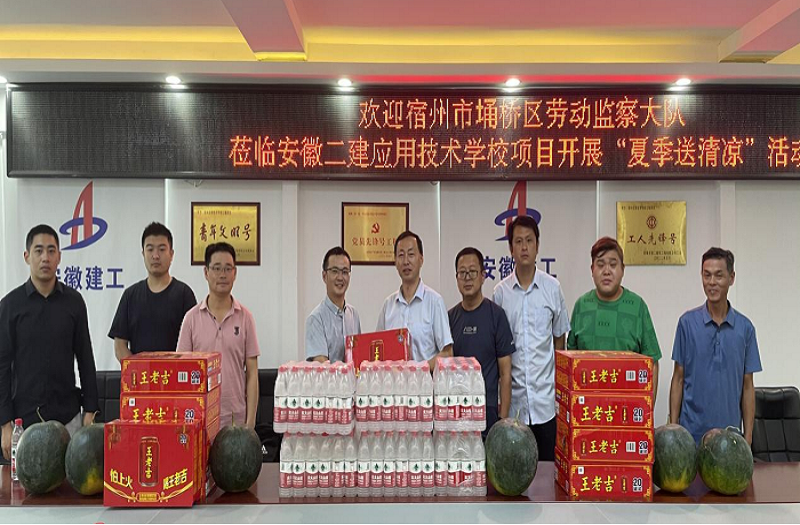 烈日炎炎,酷暑難當(dāng),為確保一線工人身心健康,督促做好夏季高溫期間安全生產(chǎn)工作,7月15日上午,宿州埇橋區(qū)勞動監(jiān)察大隊黨支部書記、副大隊長王建一行赴安徽二建宿州應(yīng)用技術(shù)學(xué)校項目開展“夏季送清涼”活動,為奮戰(zhàn)在高溫下的建筑工人送來了真摯的問候和關(guān)懷。